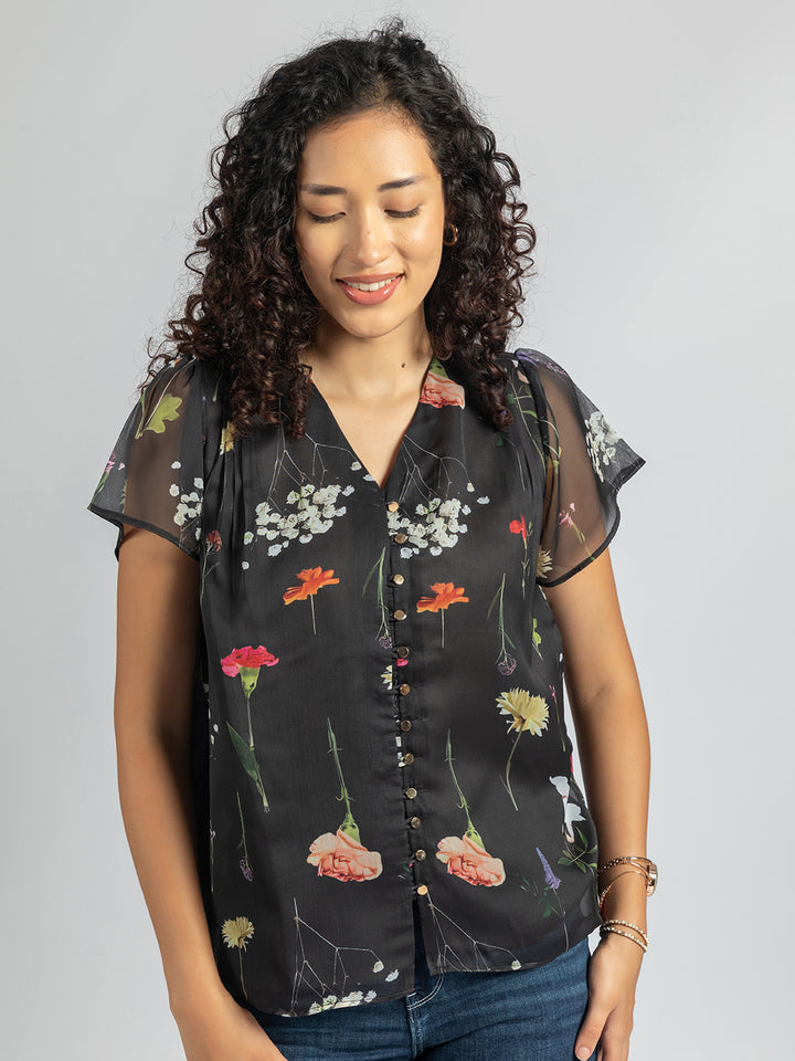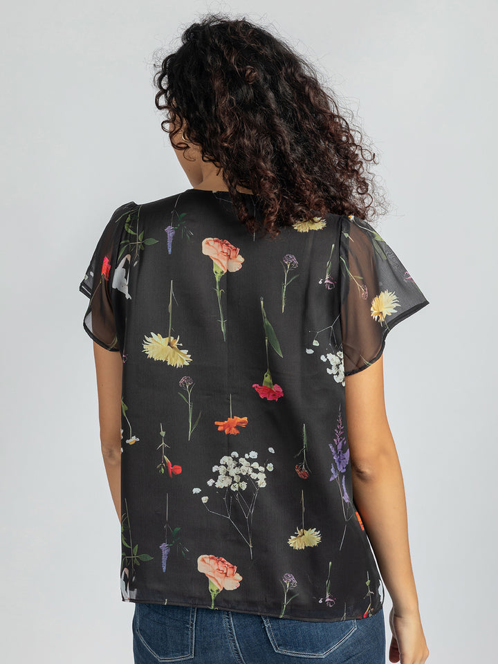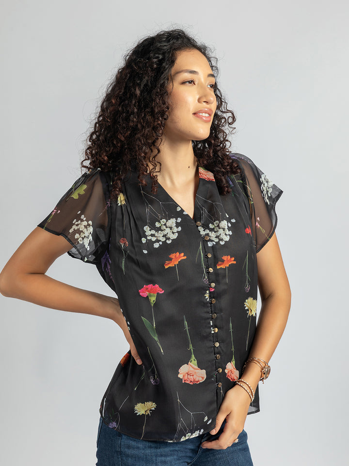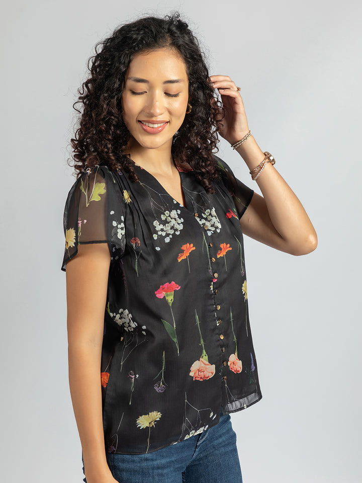 Black printed chiffon top for women with V-neck, butterfly half-sleeves, and golden buttons. A trendy women’s top perfect for chic and versatile styling.