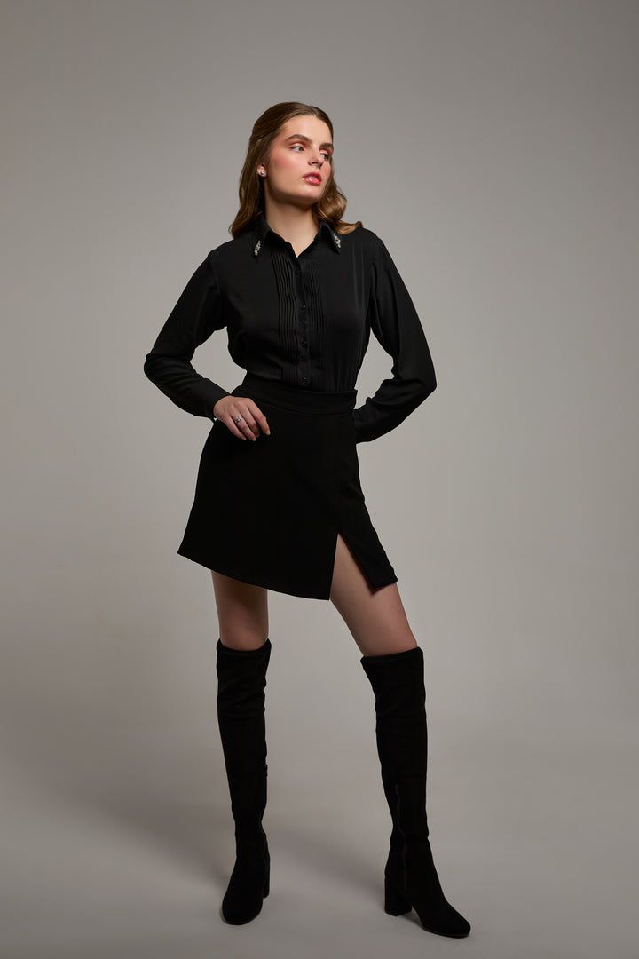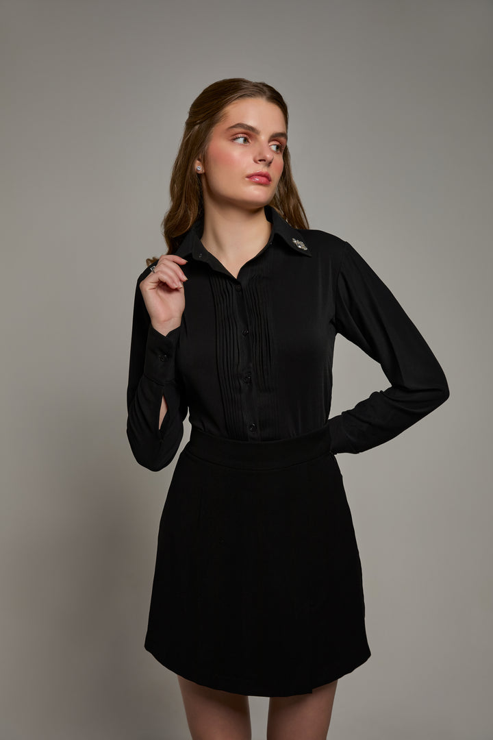 This Black Pleated Shirt Exudes Elegance With Its Fine Pleats And A Collar Adorned With A Sparkling Flower, Adding A Touch Of Glamour To The Classic Silhouette. Crafted From Lightweight, Flowy Fabric, It Offers A Sophisticated Yet Comfortable Fit, Making It Perfect For Both Formal And Evening Occasions. Pair It With Tailored Trousers, A Sleek Skirt, Or Denim For A Polished And Effortlessly Chic Look.