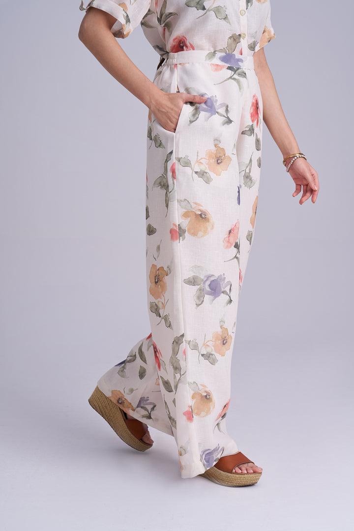 Floral palazzo pants for women in lightweight linen fabric with a relaxed wide-leg fit. These breezy pastel palazzo pants are perfect for summer, brunch, or vacation wear.
