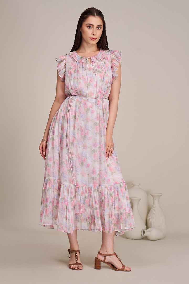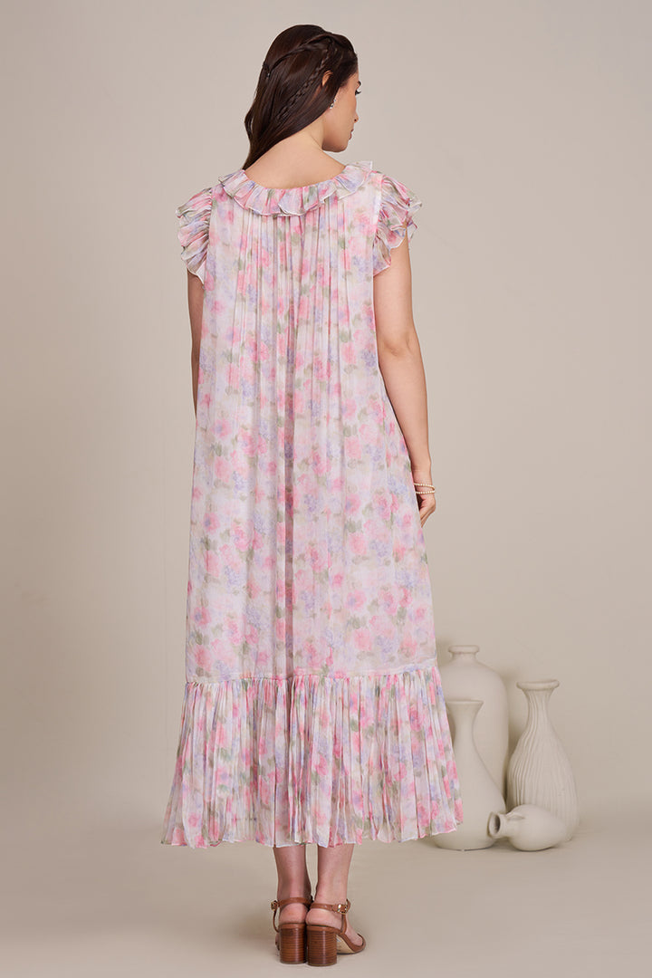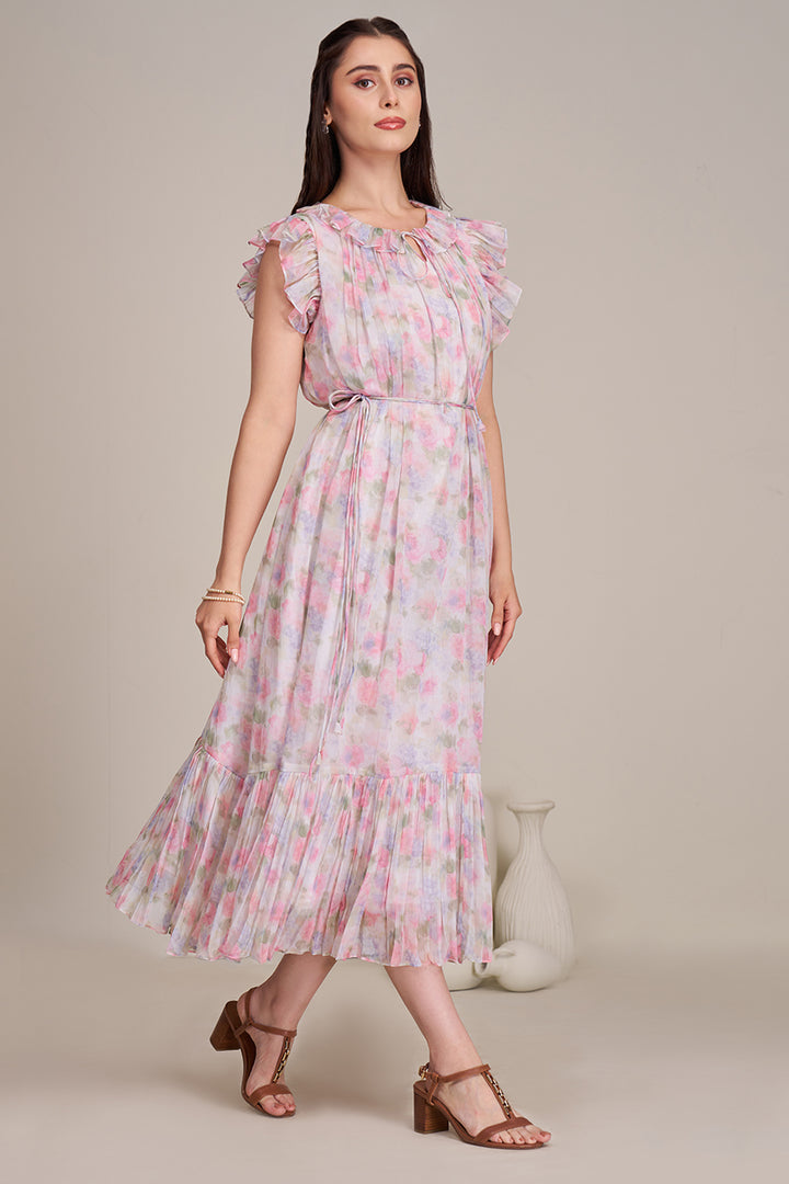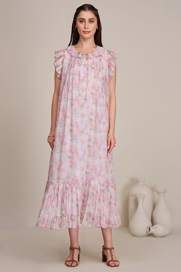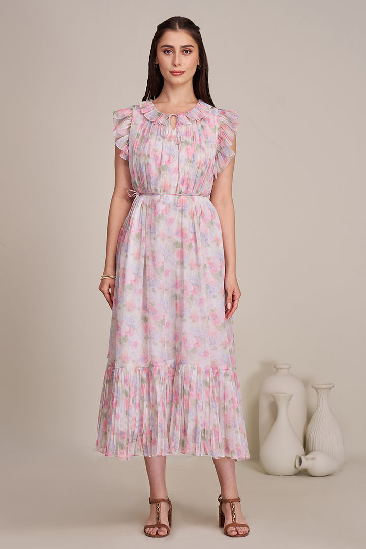 Colorful print loose fit midi dress for women – Featuring ruffled sleeves, a keyhole neckline, pleated hem, and flattering fit & flare silhouette. Perfect as a summer maxi dress, casual maxi dress, or flare dress for women, ideal for semi-formal occasions.