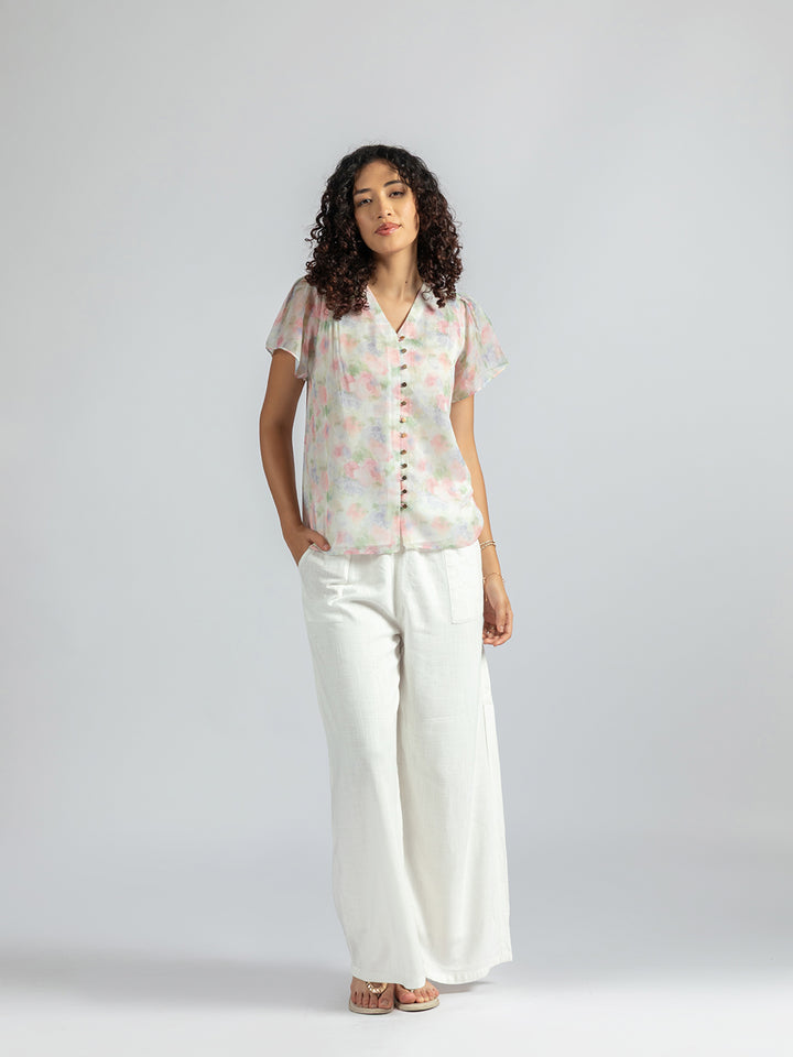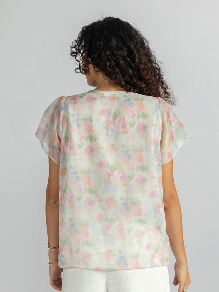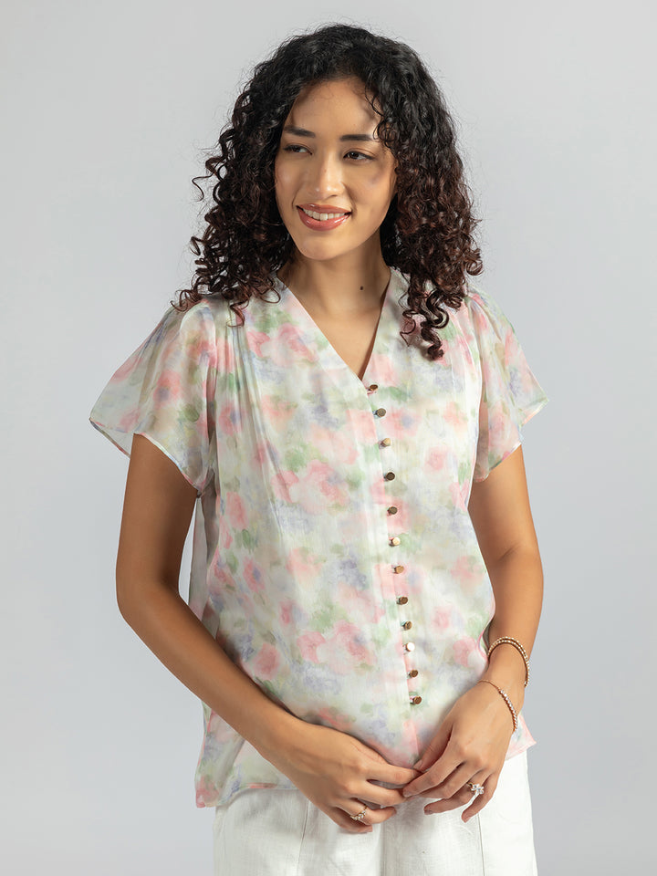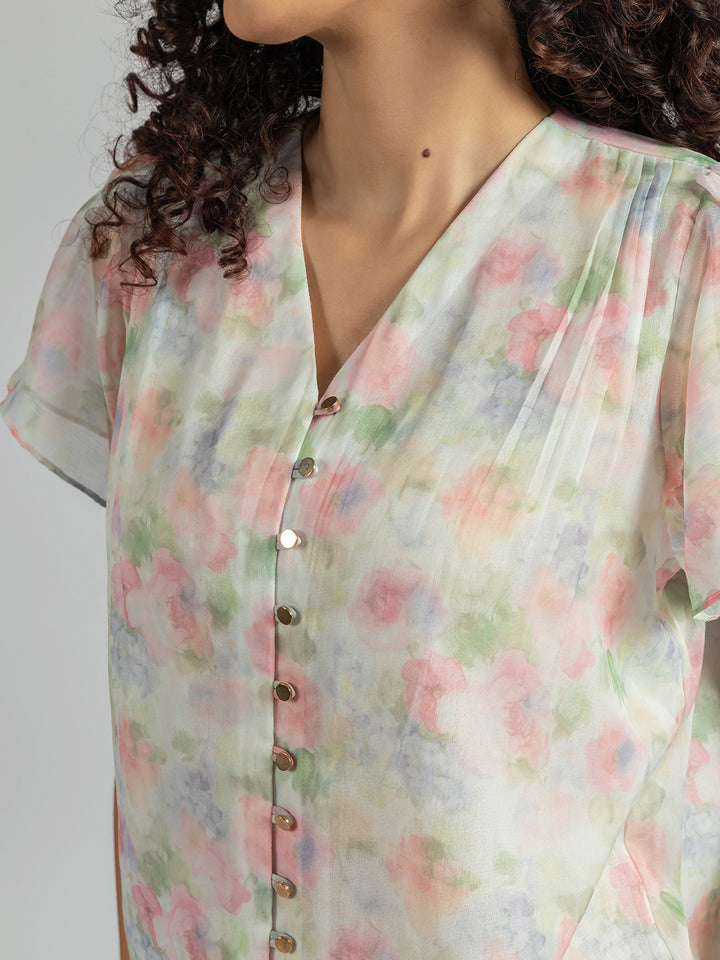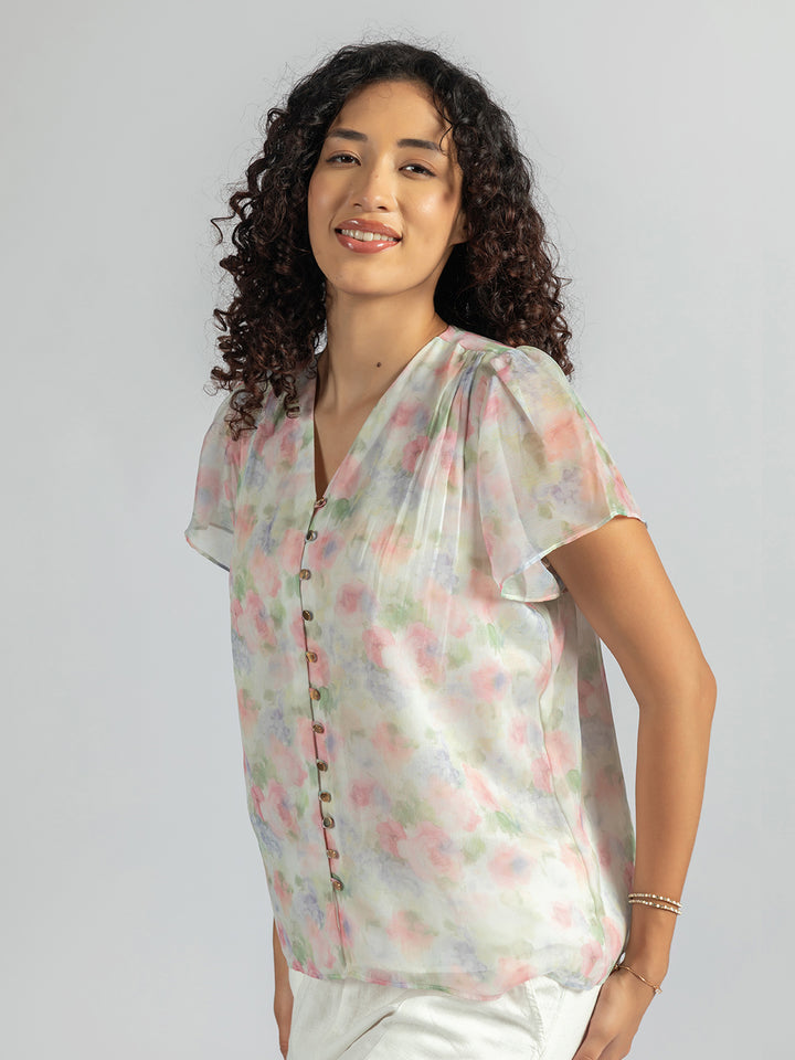 Colourful printed chiffon top for women with V-neck, butterfly half sleeves, and golden buttons. A trendy half-sleeve top for women perfect for warm-weather and casual looks.