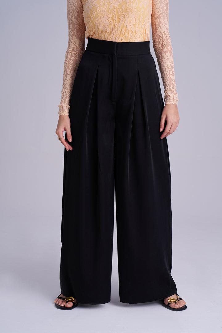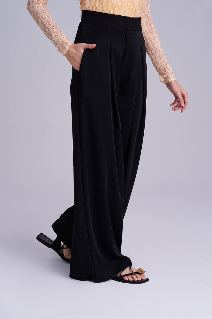 Ventablack pleated palazzo for women in smooth Korean fabric. These high-waist pleated pants offer a flattering drape and versatile style—perfect for any occasion.