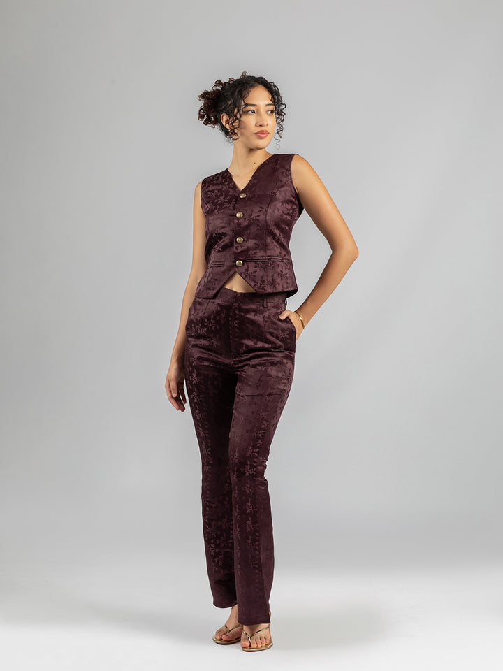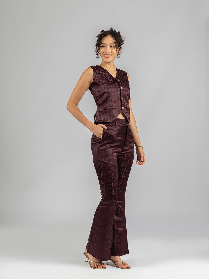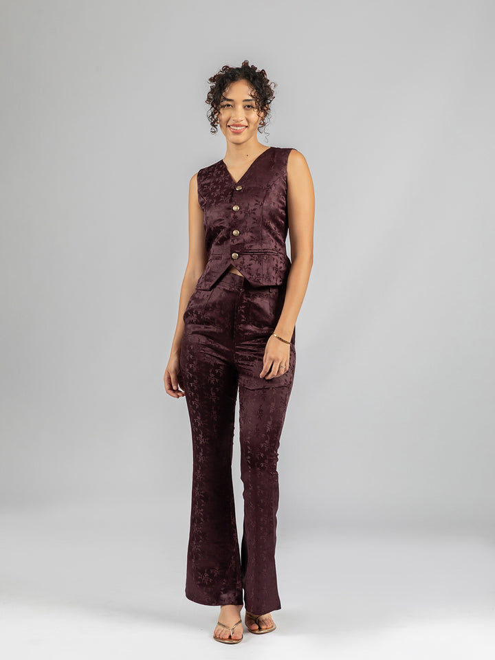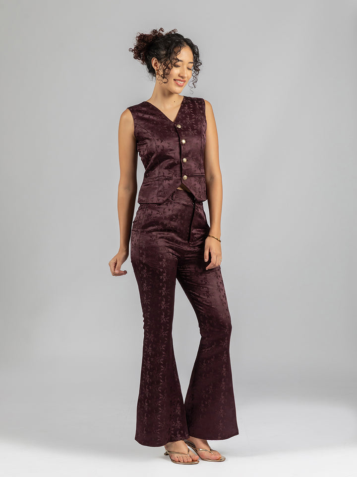 Maroon brocade flared pants for women with a subtle self-pattern for added elegance. These luxurious brocade pants offer comfort and style—perfect for festive events, formal occasions, or chic workdays.