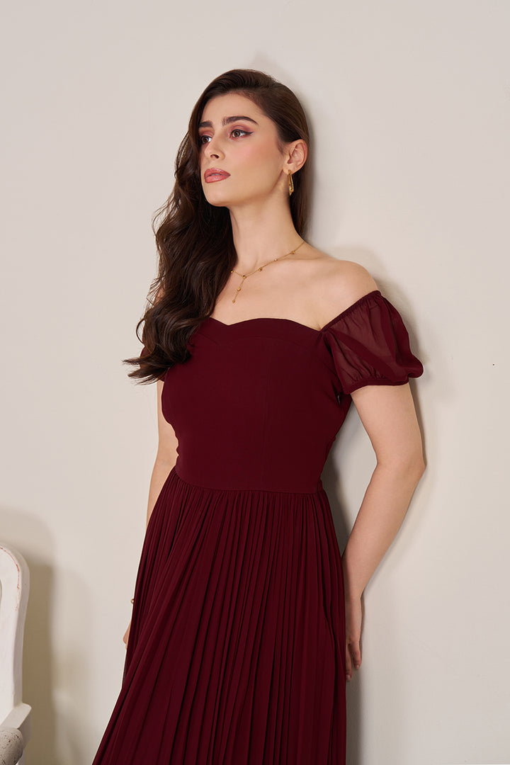 Maroon off shoulder dress for women with a flowy silhouette. A chic gown dress that doubles as a midi dress—stylish, elegant & perfect for special occasions.