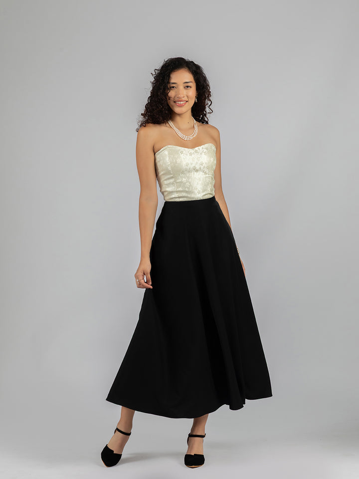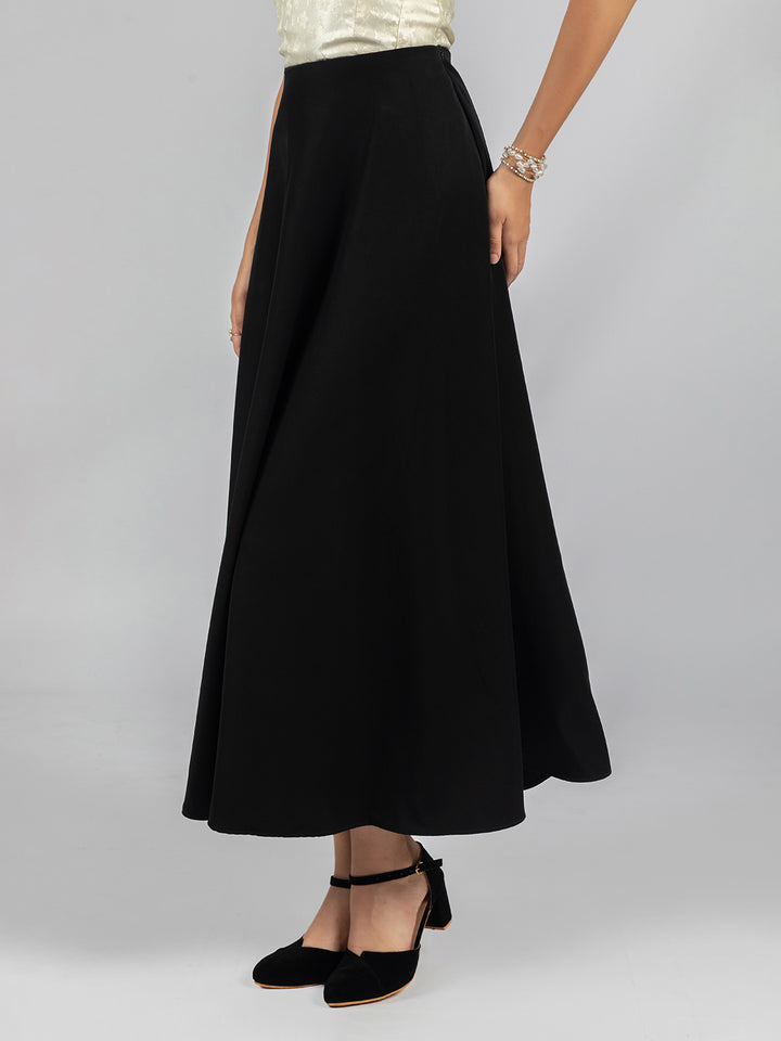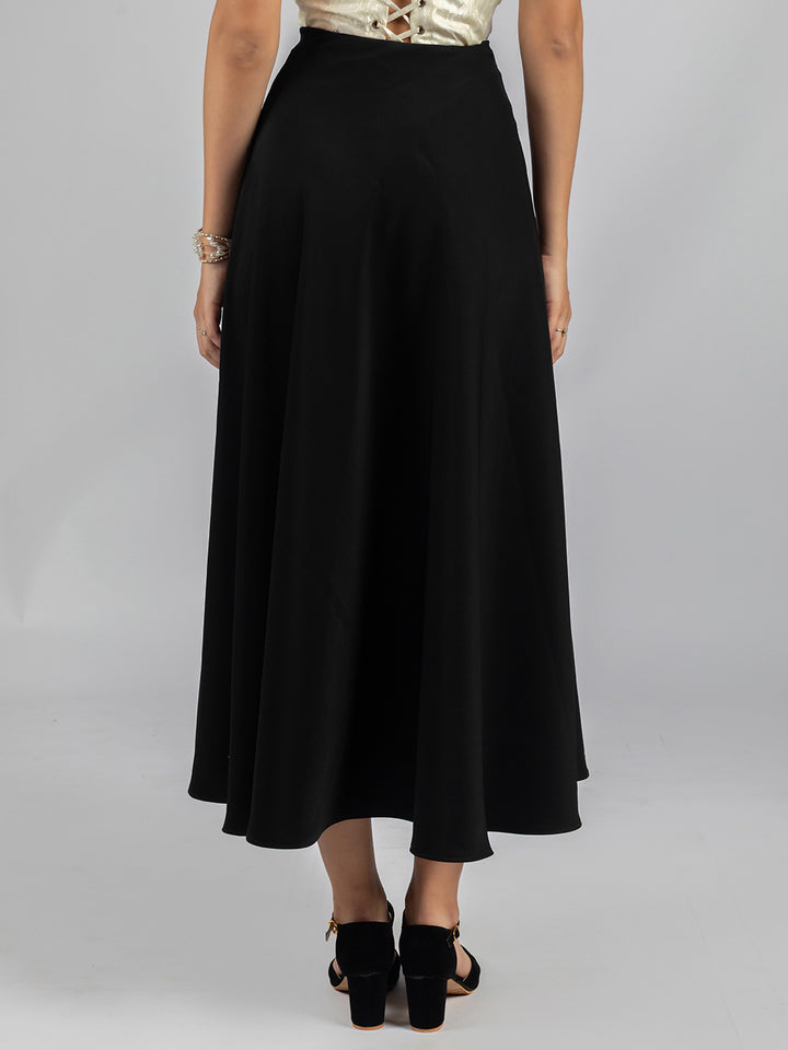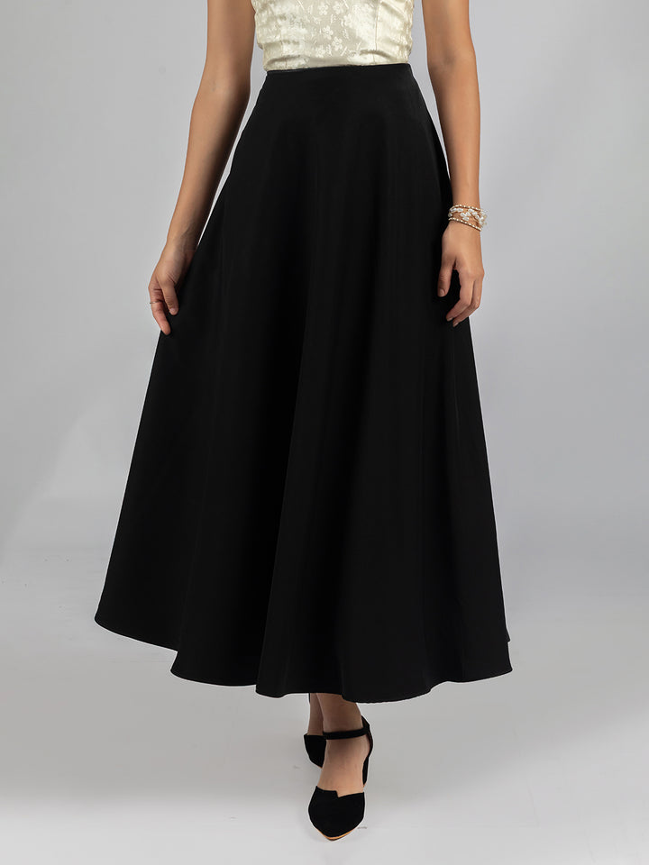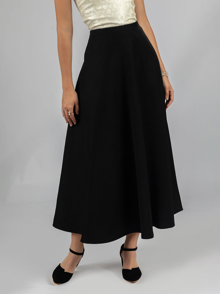 This elegant black umbrella skirt is crafted from luxurious, high-quality fabric that flows beautifully with every step. Its classic flared silhouette offers a timeless charm, making it a versatile piece for both day and evening looks.