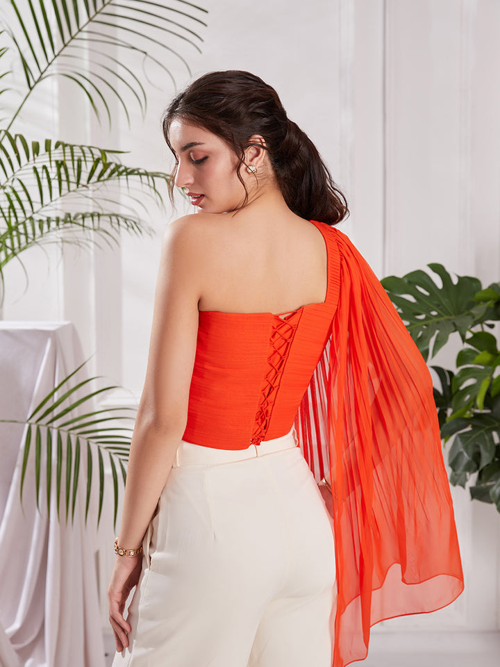 Orange hand-pleated georgette corset top with one shoulder and flattering silhouette. Adjustable back string ensures a perfect, comfortable fit.