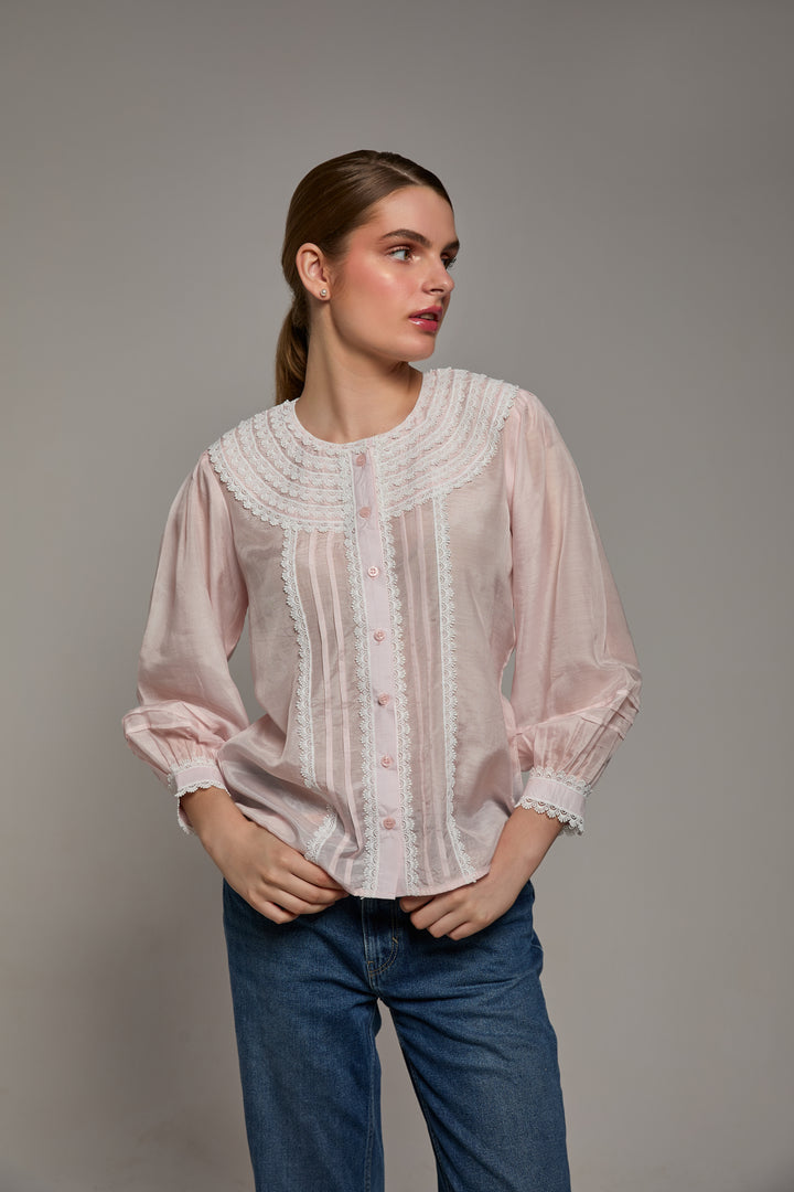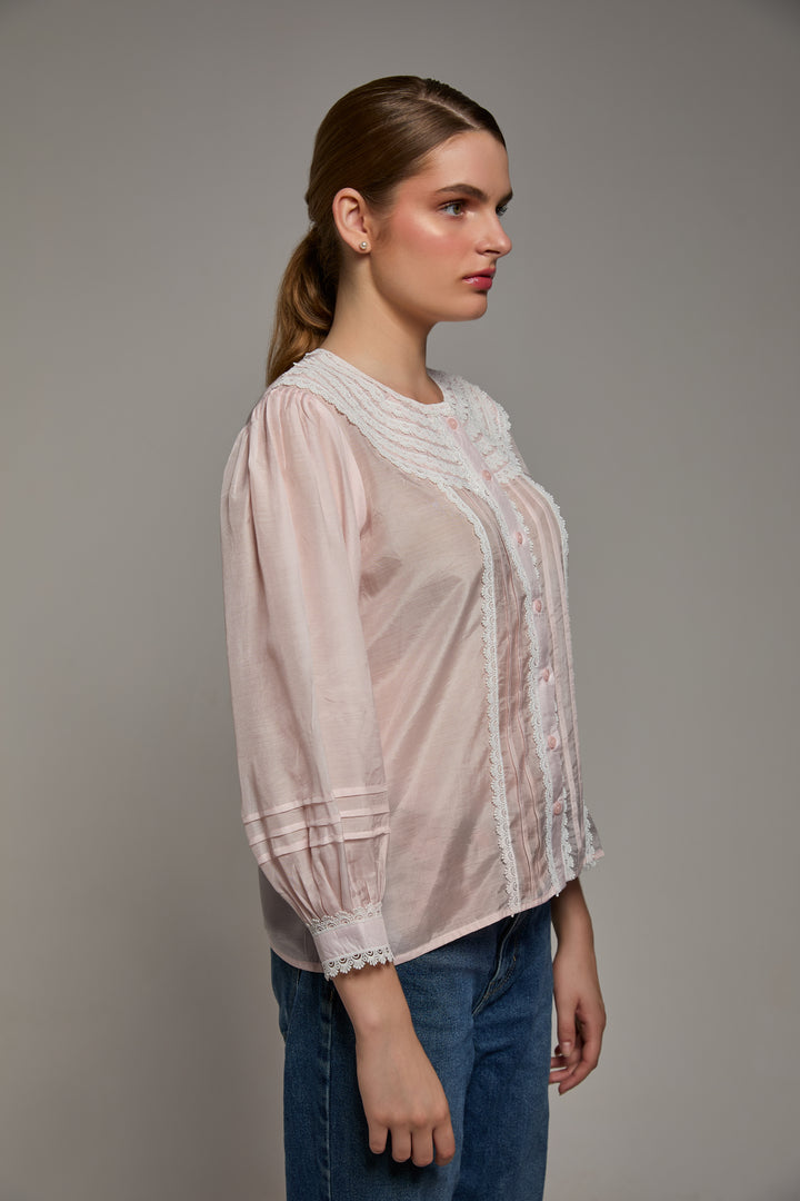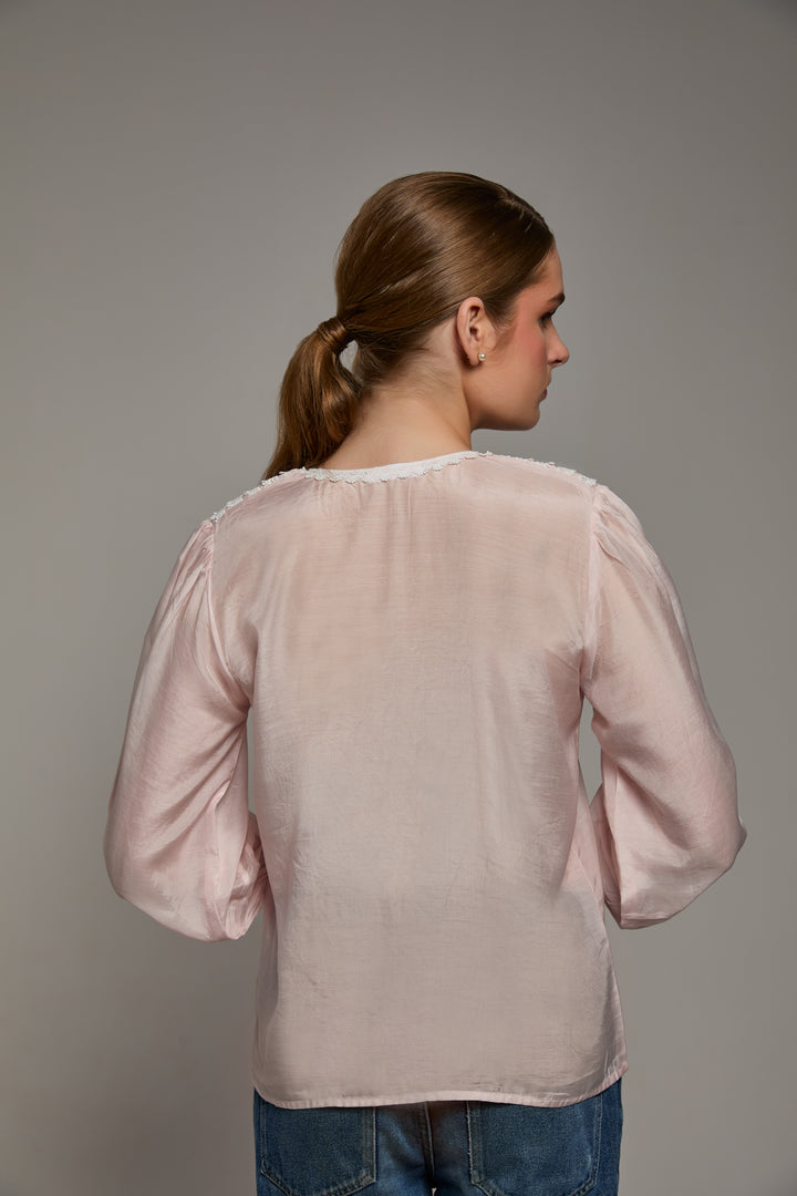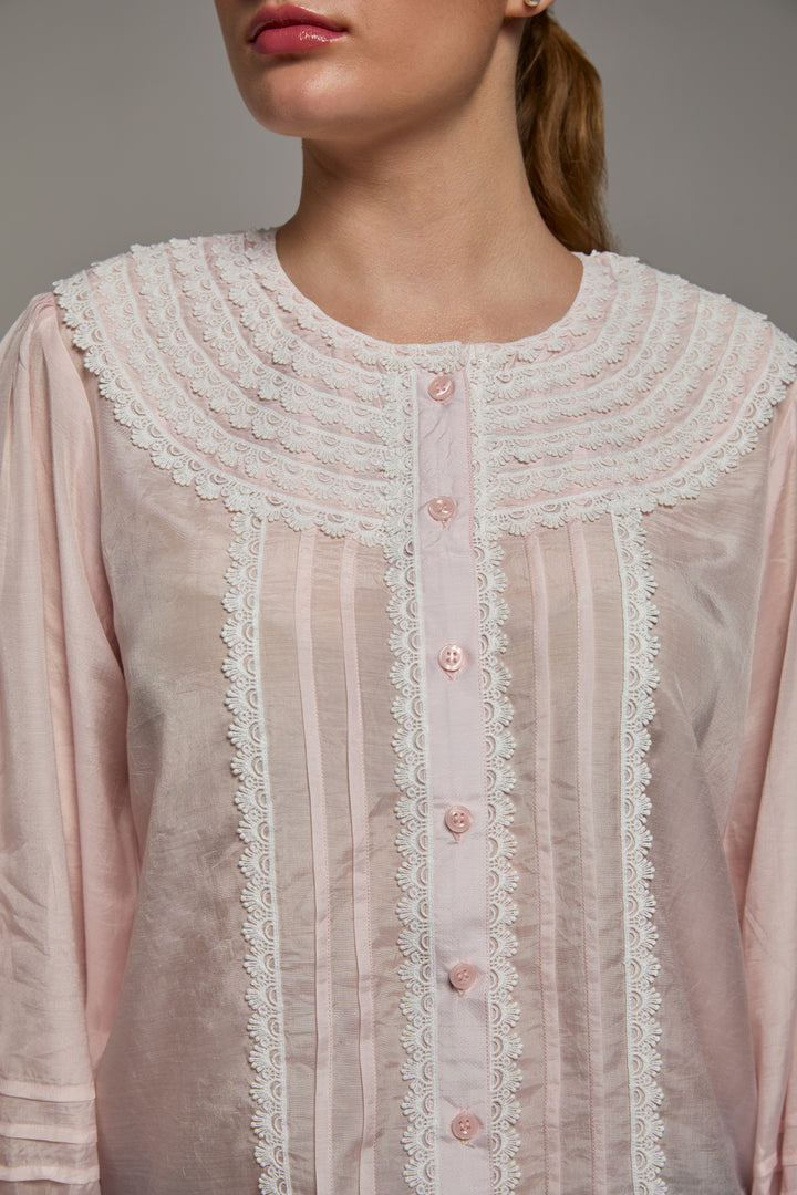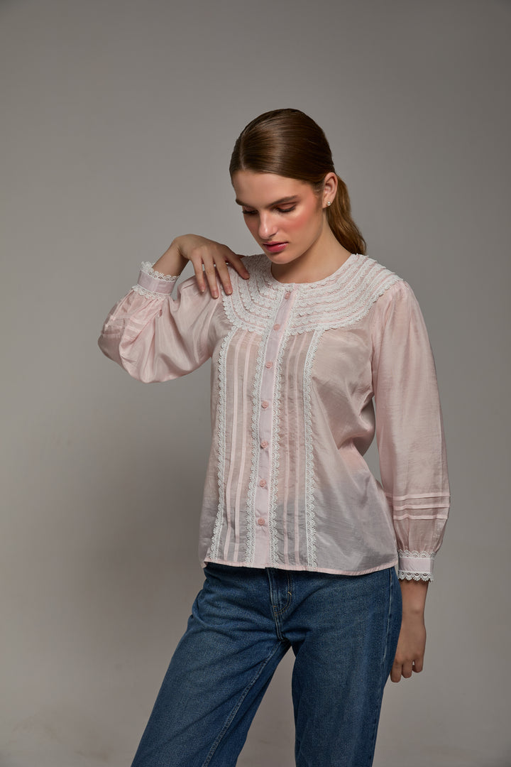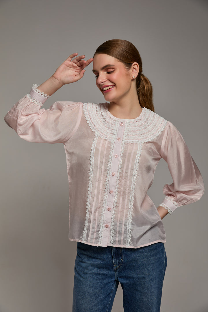 This Elegant Top Seamlessly Blends The Luxurious Feel Of Cotton Silk With Intricate Lace Detailing, Creating A Sophisticated Yet Versatile Piece. Featuring Full Sleeves And A Front Button Opening, It Offers A Refined Look That Can Be Styled For Both Formal And Casual Occasions. The Lightweight, Breathable Fabric Ensures Comfort While Maintaining An Effortlessly Chic Silhouette. Pair It With Tailored Trousers, Skirts, Or Denim For A Polished And Timeless Ensemble.