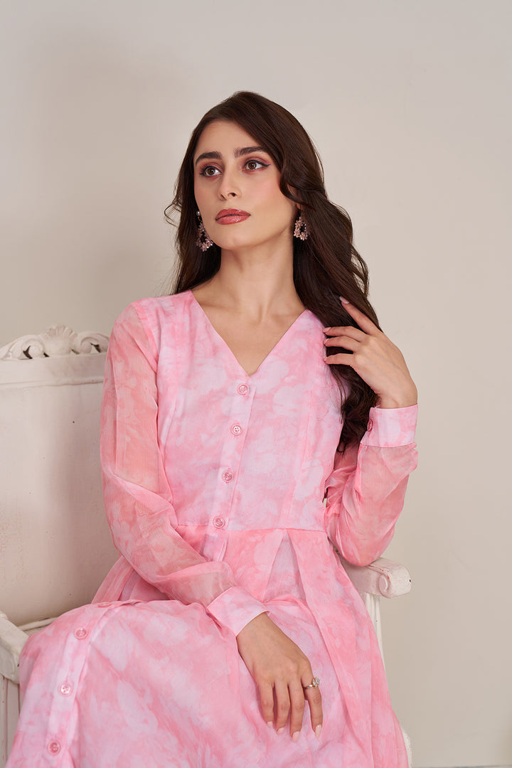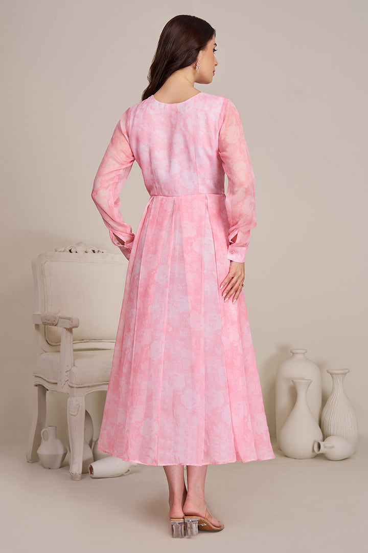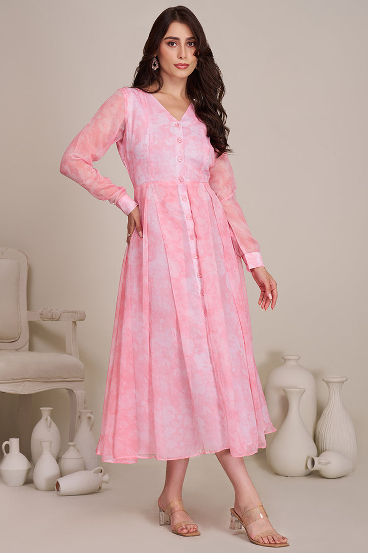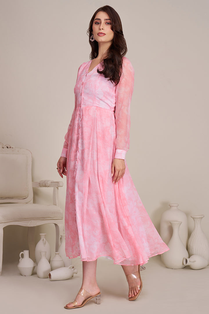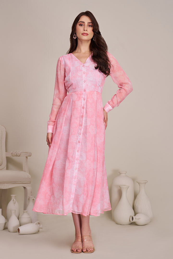 Add charm to your wardrobe with this elegant pink midi dress for women. Designed with a button-down front, long sleeves, pleated skirt & a flared hemline, this versatile flare dress is perfect for casual parties, day outings & effortless everyday style.
