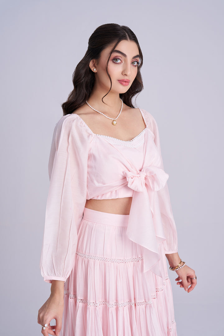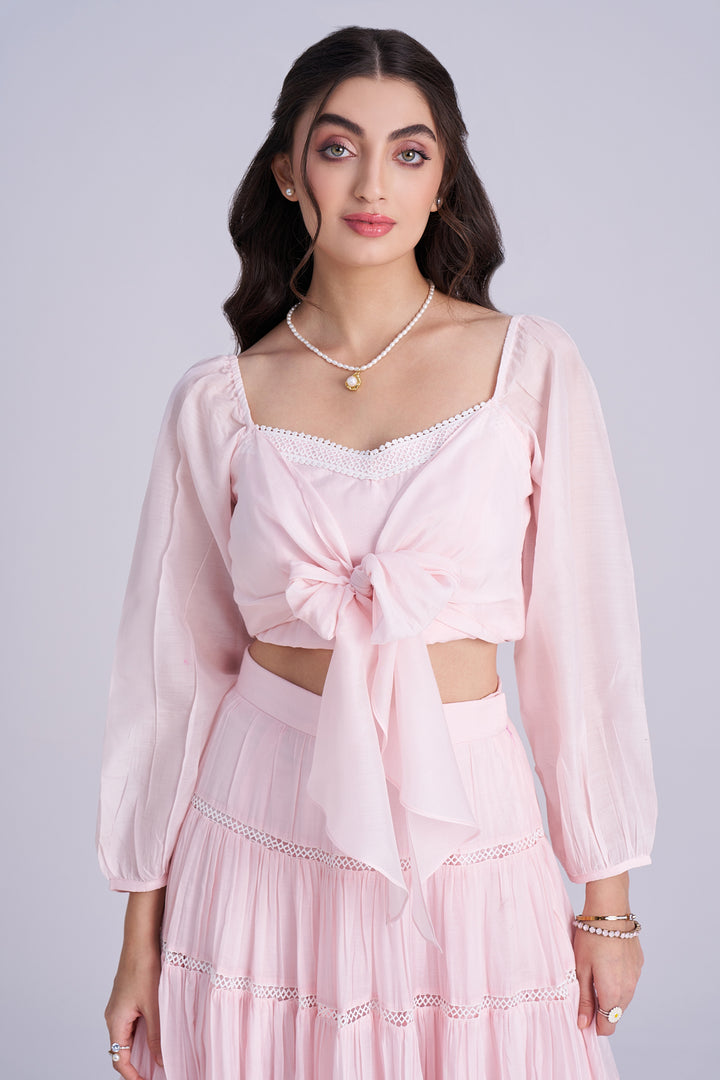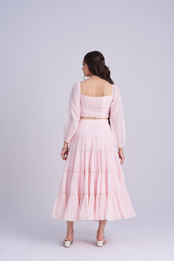 this charming pink cotton cord set features cute full sleeve lace top with a stretchable back that gives you comfortable fit, and tired skirt with lace inserts and flared hem.
