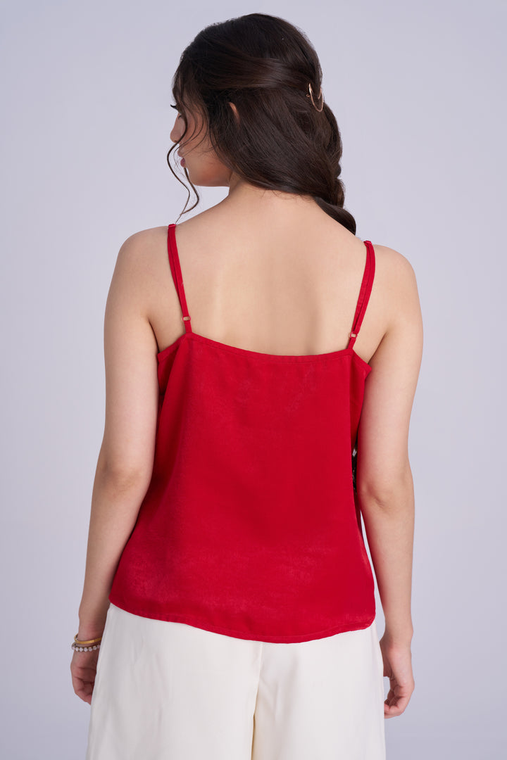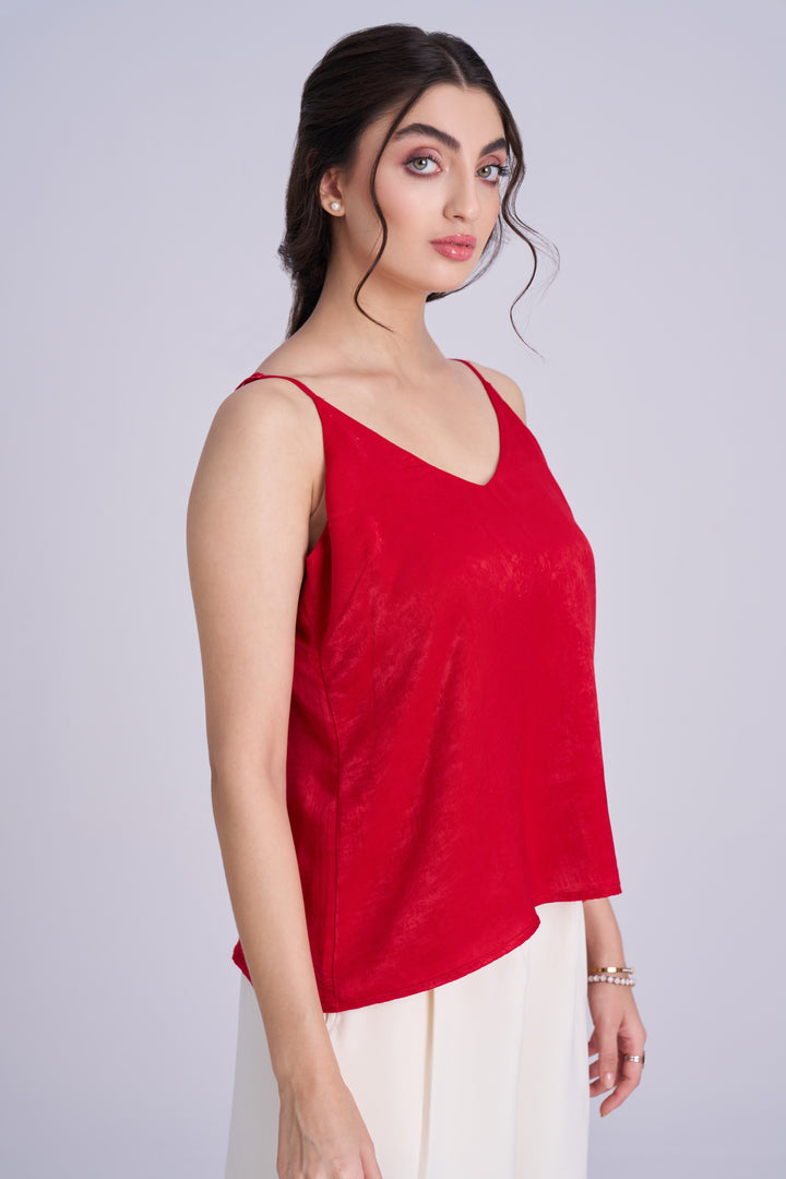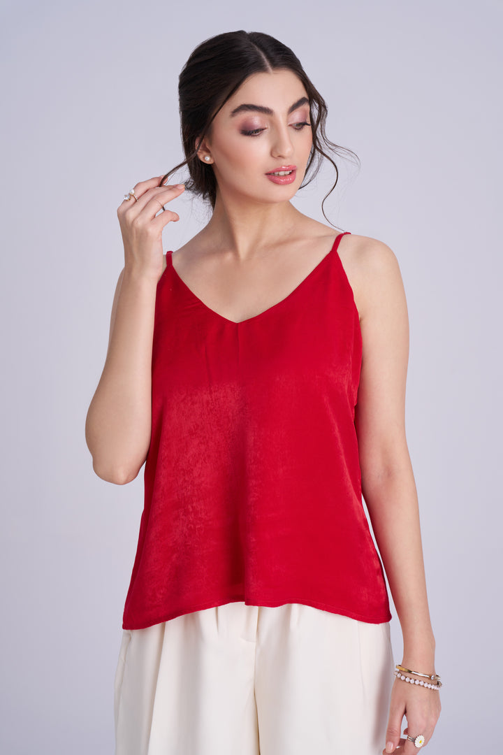 Red satin-velvet tank top for women with V-neck and adjustable straps. A versatile women’s top perfect for summer or layering.