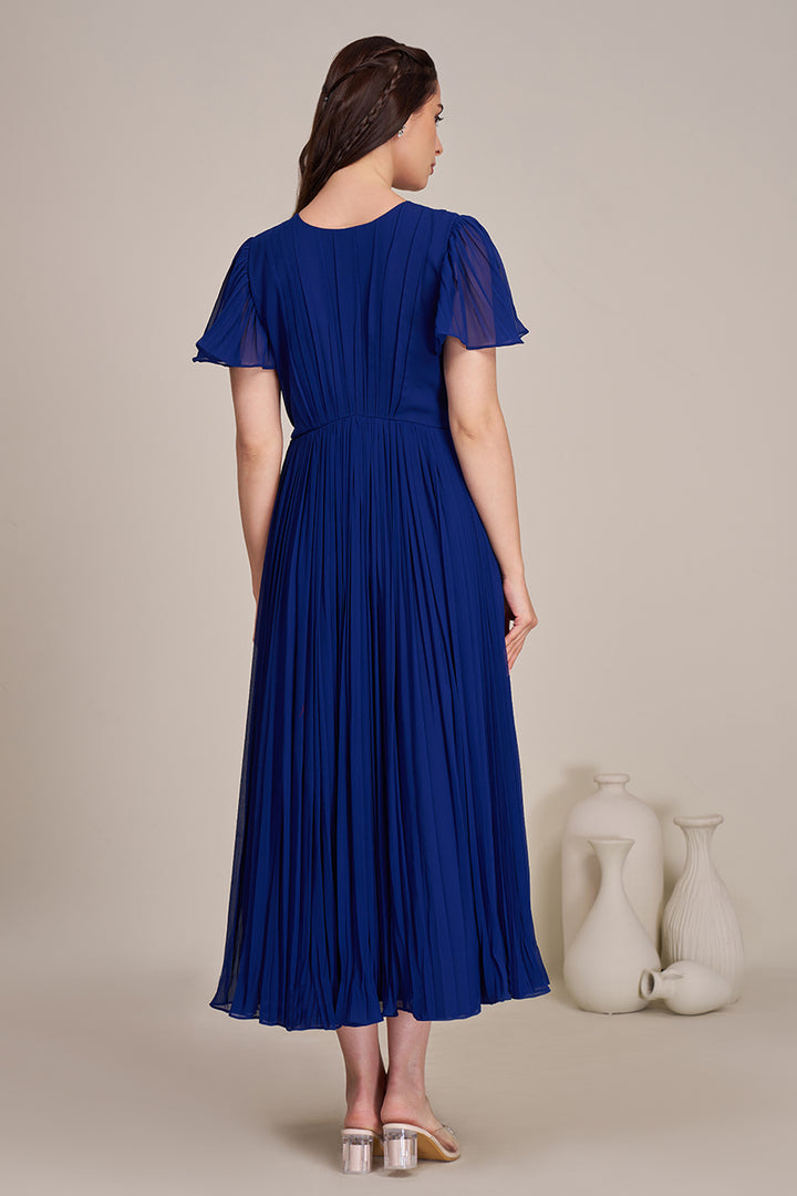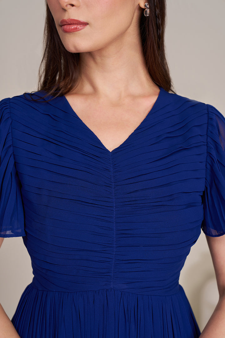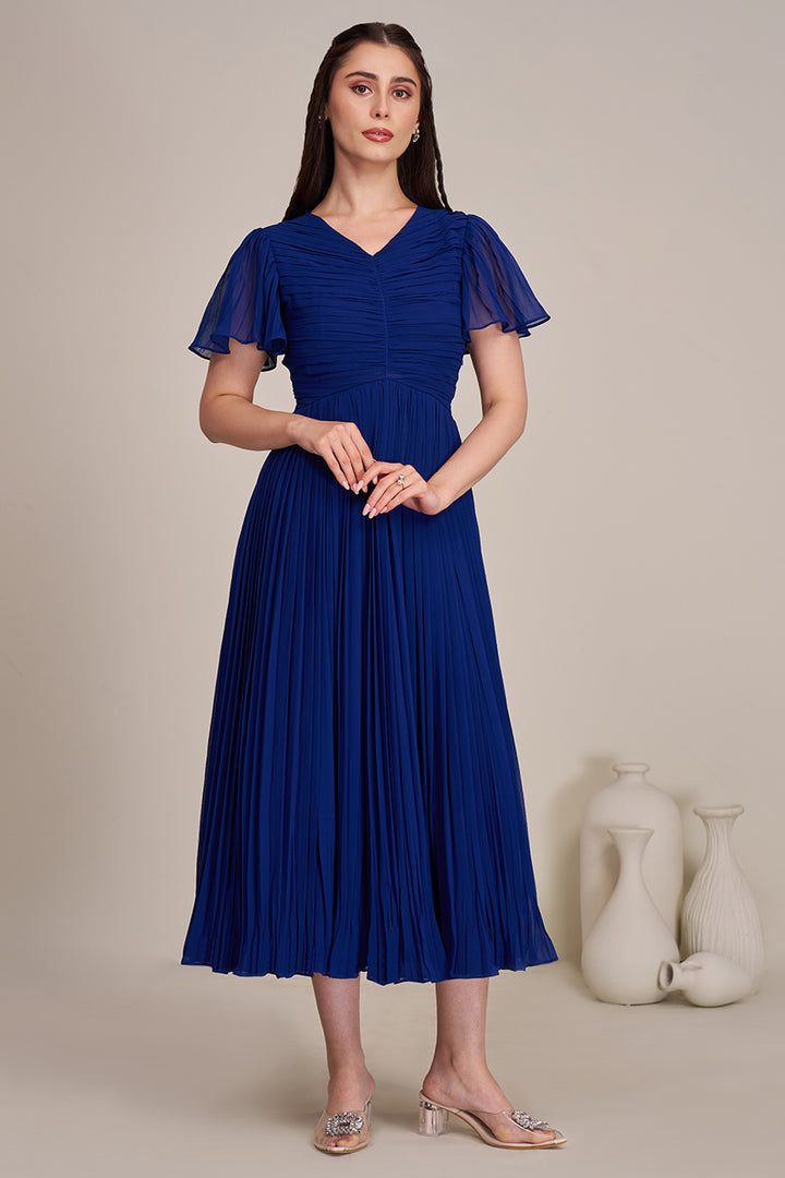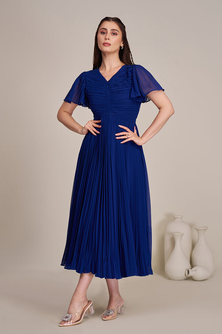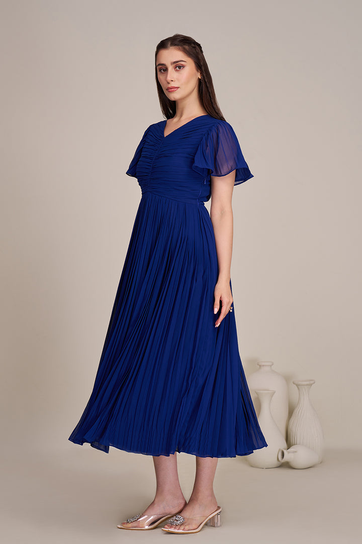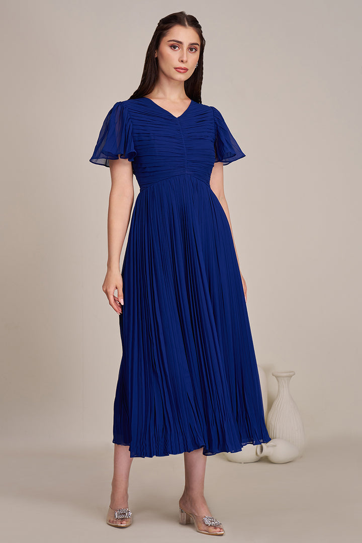 Royal blue midi dress for women – Featuring flutter half sleeves, a ruched bodice, and a flowy pleated skirt. Perfect as a gown dress, party dress, or designer/trendy dress for women, ideal for special occasions.