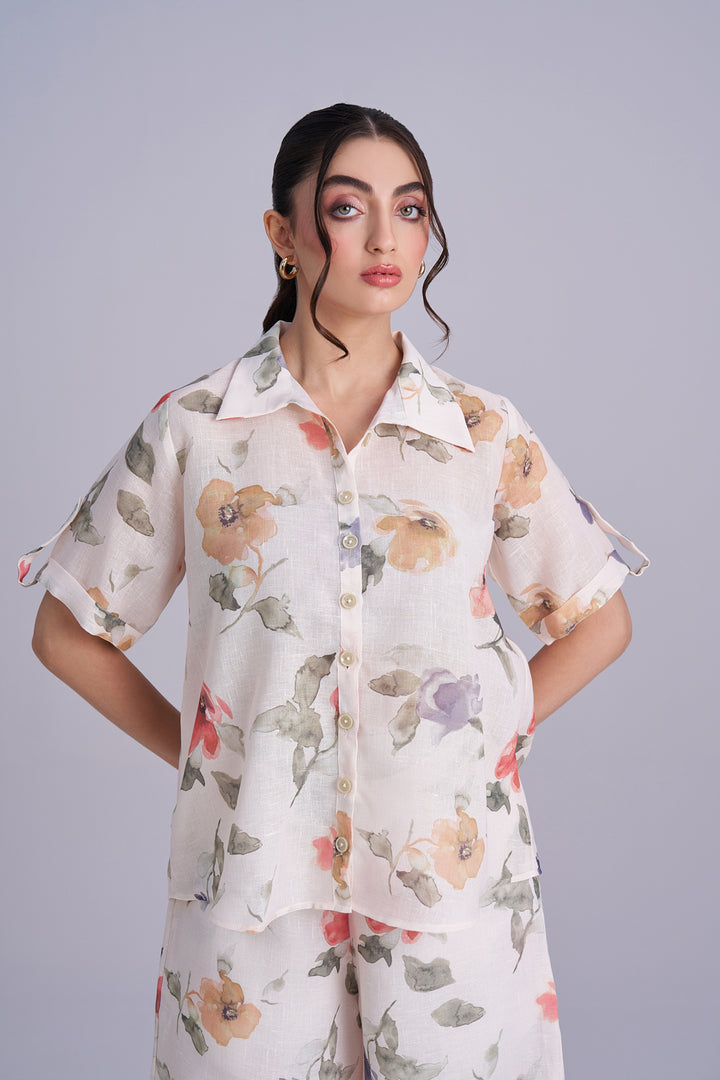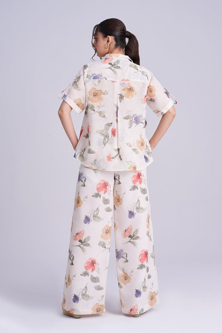 this floral printed linen cords set features button down opening and half sleeve and matching stylish palazzo, its perfect for casual outings, vacation wear or formal or semi formal events.
