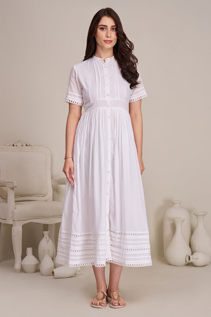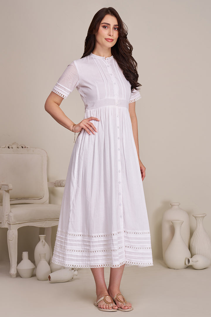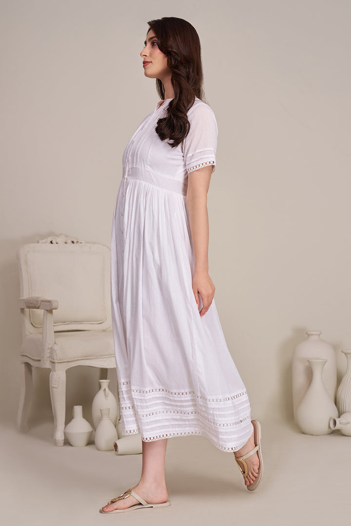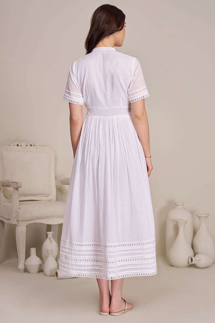 White mule cotton lace midi dress for women with fit & flare design features half sleeves and lace inserts in sleeves and skirt.—timeless style from Indian clothing brands.