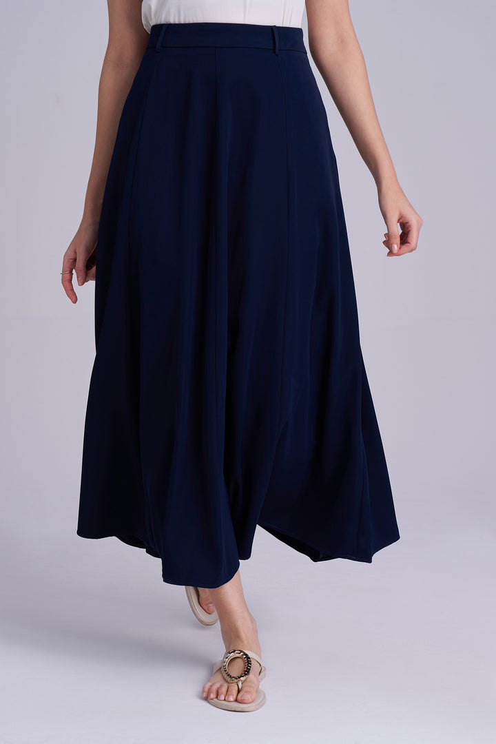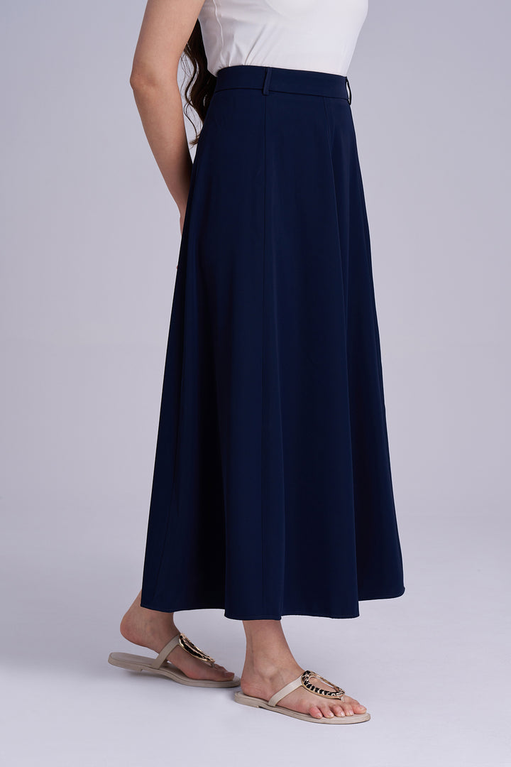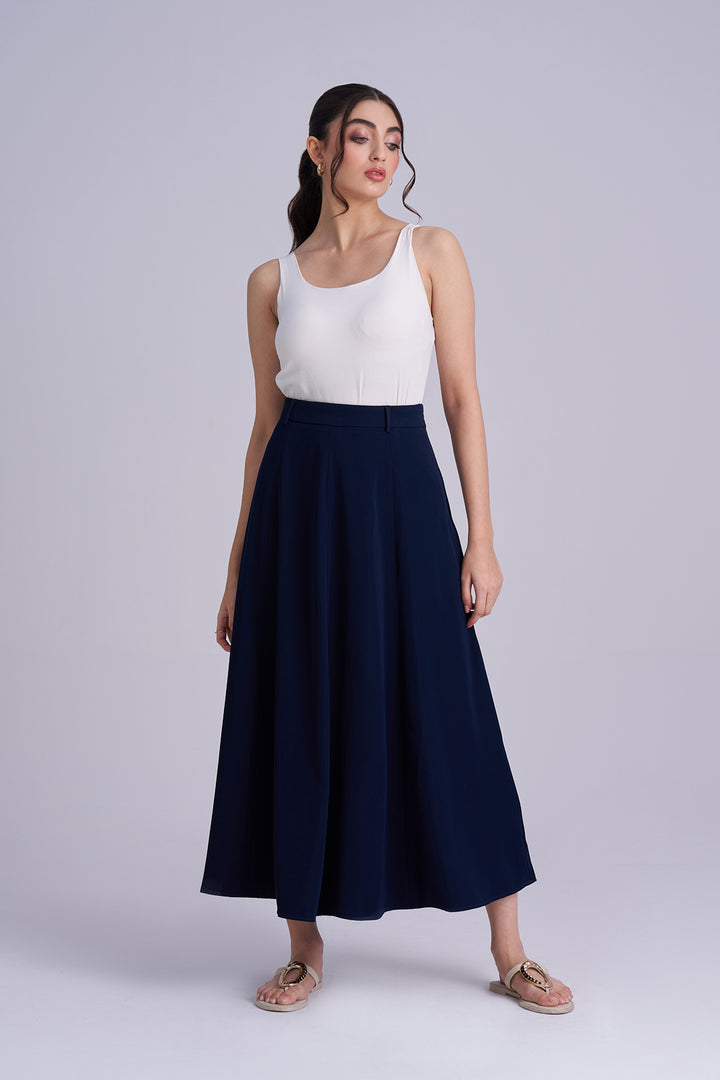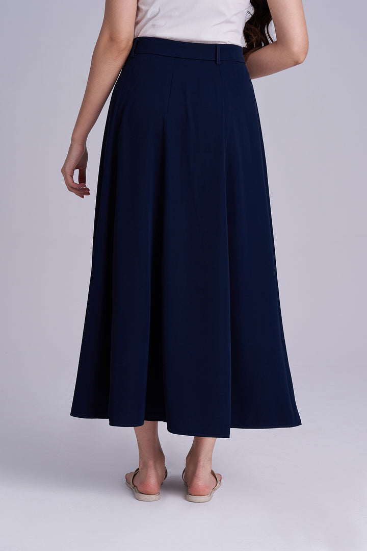 Blue and white panel skirt in smooth Korean fabric with elegant pleats. This versatile blue long skirt offers a classic midi skirt style for both casual and formal looks.