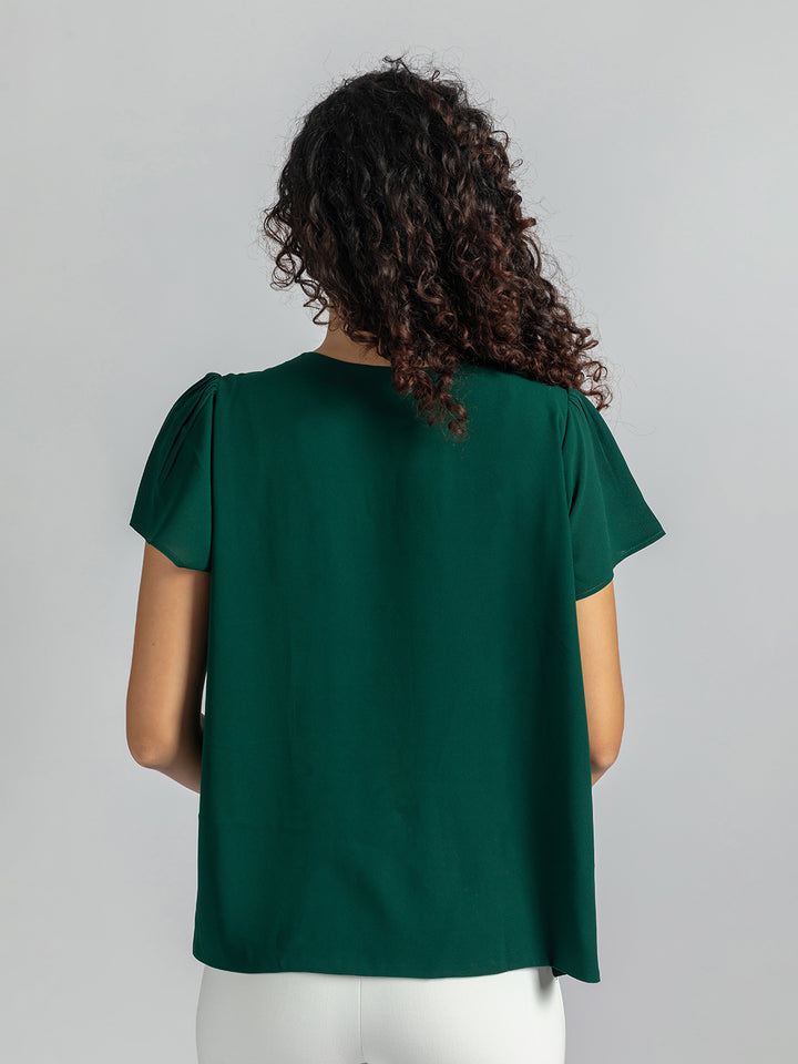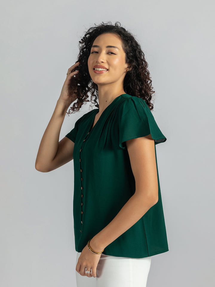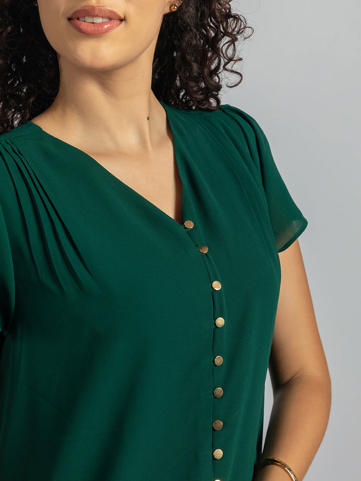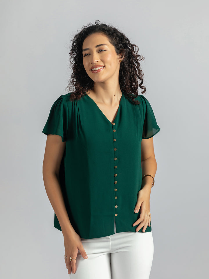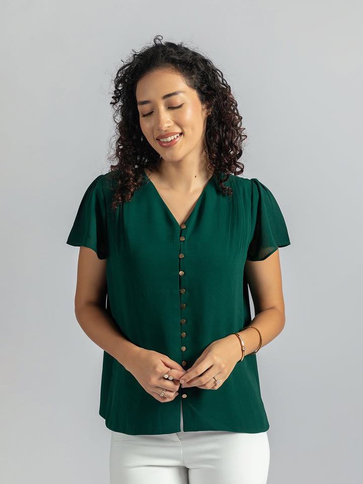 Green georgette top for women with a flattering V-neck, butterfly half-sleeves, and elegant golden buttons. A stylish ladies’ top perfect for any occasion.