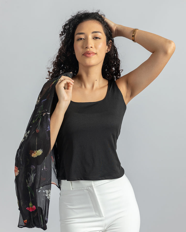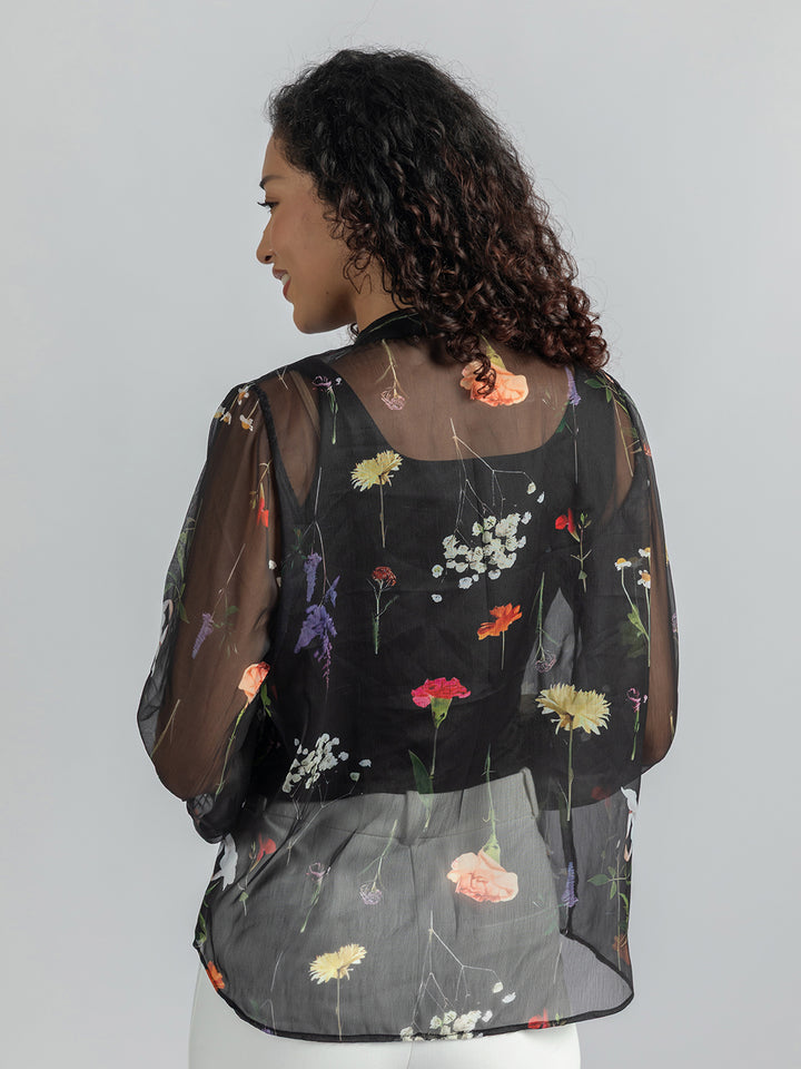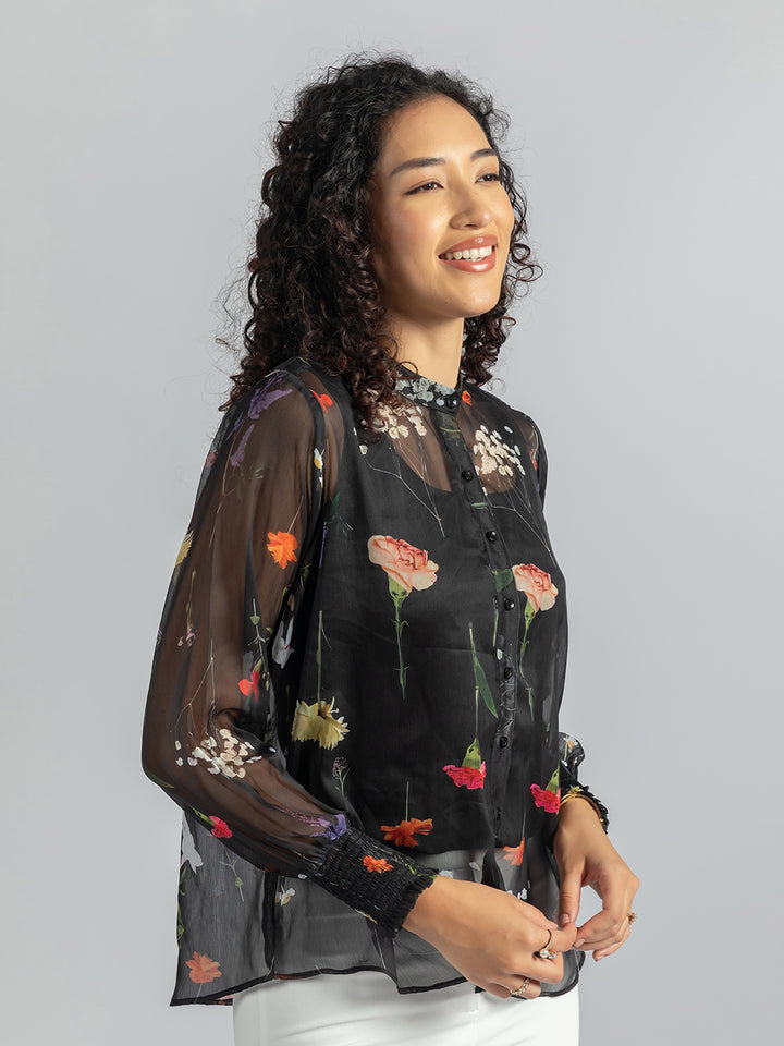 Black floral chiffon shirt for women with full sleeves and button-down design. A stylish women’s top perfect for chic and versatile looks.